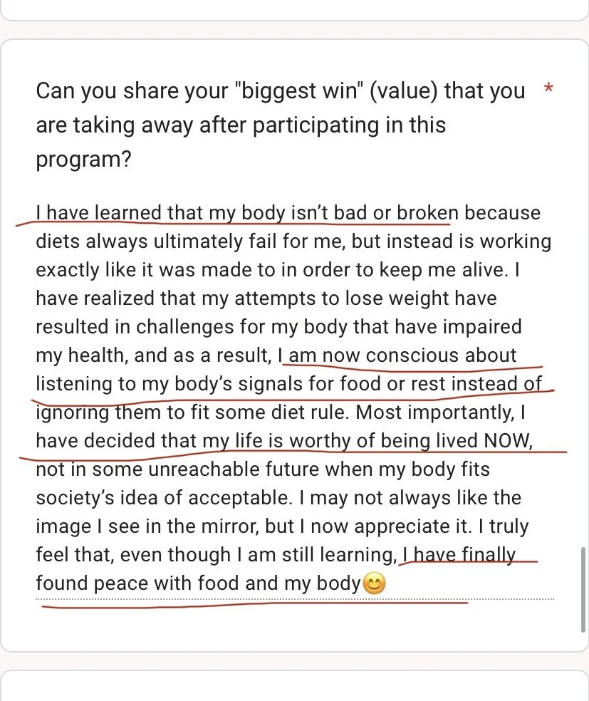 4) If you are in an active stage of an eating disorder, this program will not be the best fit for you (YET) and I recommend that you seek individualized treatment from a Registered Dietitian and Therapist with specialties in treating eating disorders. If you are in recovery from an eating disorder and feel motivated to solidify your healing journey with deeper body image work and Intuitive Eating, this WILL be the program for you.